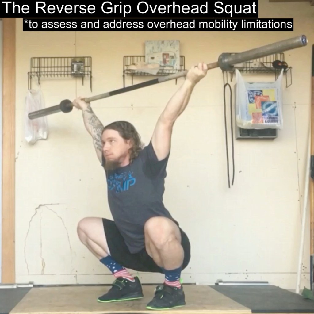 A quick test you can perform to see if the forward twist is a mobility restriction, or if you are physically capable but simply need to change your muscle memory, is to try and perform an overhead squat with a reverse grip. Position your hands wide and hold the bar as if you were going to “curl” it (come on guys, I know you know how to curl) and place it overhead; this will force the arms to stay twisted back. Can you keep the elbows locked and the bar over the top of the head as you sink to your lowest squat position? If not, then you’re lacking sufficient mobility to maintain that specific shoulder orientation within overhead squats and snatches. This can be stemming from any lower body mobility limitation(s) we might have previously uncovered, or something in the upper body that we may discover with assessments in that area. If you were able to complete the overhead squat, then this indicates you are capable and can potentially use the reverse grip overhead squat with light loads to help learn and engrain the elbow position and upper body engagement. I regularly come across athletes that surprise themselves in their ability to do this, or at least do far better than they thought they would.