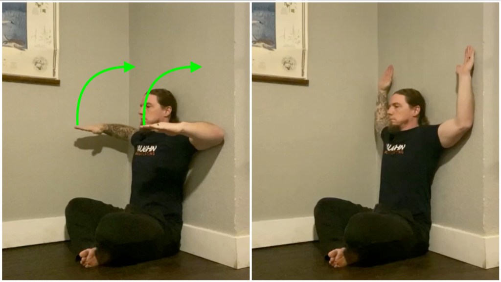 To screen for your internal rotation, sit against a wall with the same contact points as the prior test. Start in the 90-degree “L” position and rotate your hands as far toward the ground as you can without your shoulder blades popping off the wall. Ideally, you should be able to internally rotate your shoulder and the forearm to at least reach parallel relative to the ground.