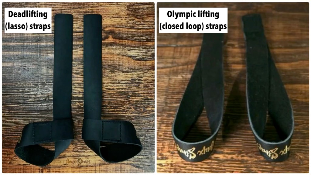 - Olympic lifting (or closed loop) strap: Made without loops on either side and the loop for the hand is created by overlaying one end on top of the other, typically sewn together or held together with tape.