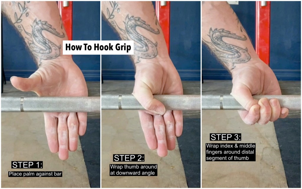 Let’s get through that time as efficiently as we can by adding in some long standing holds with the hook grip at the ends of your workouts for a few weeks. We’ll start off with light loads after the last exercise you’re using the hook grip with for the day. You’ll simply stand up with the weight as in a snatch or clean deadlift, and with the bar at the hip, hold for 20-30 seconds (arms straight and twisted in, shoulders relaxed down, and hook grip intact). Do this for 2 to 3 sets of just the single rep, progressing up a set or two AND holding a little longer on each rep each following workout as you begin to get more comfortable (keep in mind that it WILL get worse before it gets better). Ensure an even mix between snatch and clean grip (alternating days is a good protocol). This will as well expedite the learning and strengthening process of this grip that is necessary for optimal Olympic lifting.